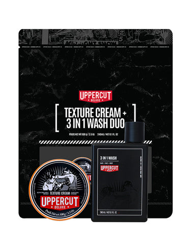 Duo kit uključuje Uppercut 3-in-1 Wash i Texture Cream, savršeni dvojac za njegu i stiliziranje koji donosi praktičnost i kvalitetu. Ovaj set je idealan za sve koji žele jednostavnu, ali učinkovitu rutinu njege i oblikovanja kose.